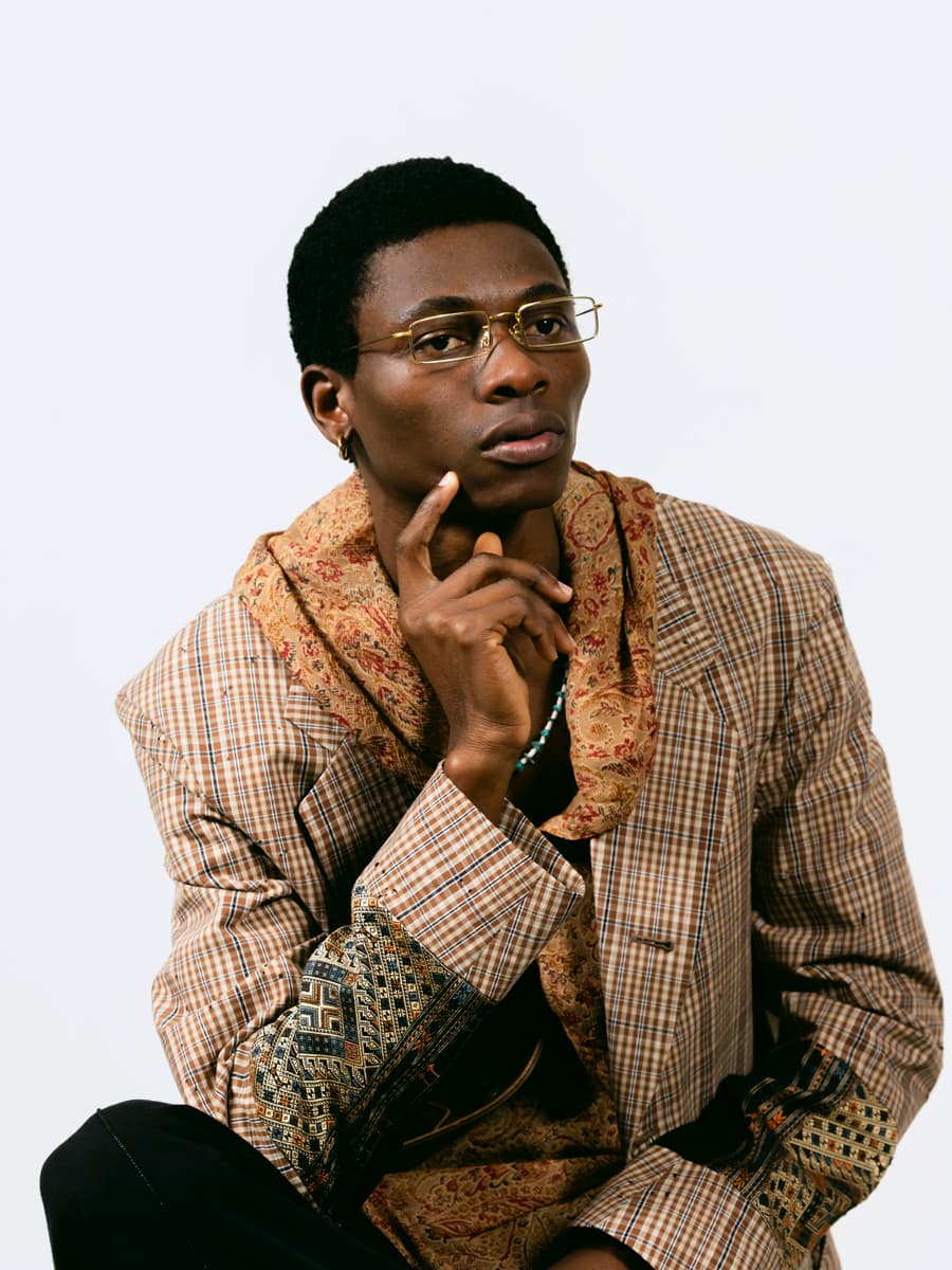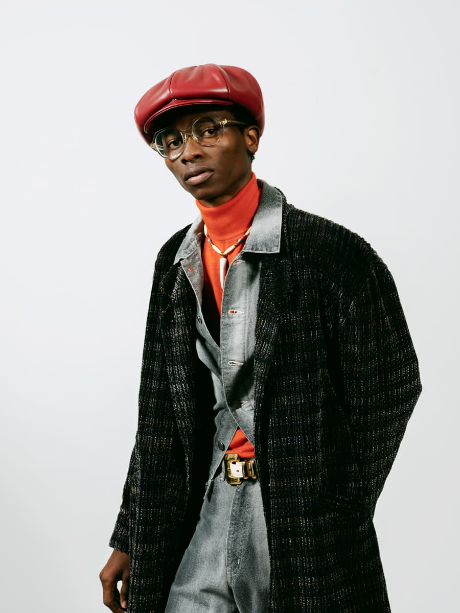 「Tradition & Innovation」の哲学のもと独創的ながら、日常に寄り添うアイウエア作りを行うユウイチ トヤマ.。ラッパーから愛されたアイウエアを彷彿とさせる、60’sをイメージしたフロントシェイプはヒップホップを愛するデザイナーの外山ならでは。リアーナなども愛用する「ベニー・アンダロ」の帽子を使用したスタイリングは90年代のスタイルを想起させながらも、より現代的な表現に落とし込まれている。