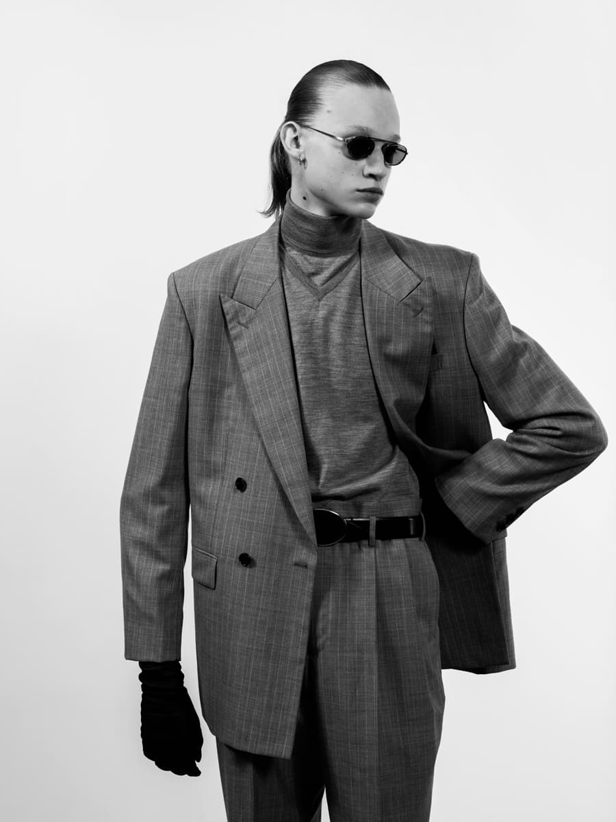 1917年に「木村製作所」としてスタートし、世界で初めてチタン製のアイウエアの量産化も実現したカメマンネン。切削とプレスの複合加工によりブリッジまでが完全に一体化した本作は伝統に裏打ちされた確かな技術によって、ほかブランドでは表現し得ないフューチャリスティックな雰囲気を醸し出している。グレーのセットアップに黒の小物を合わせたミニマルなスタイルでアイウエアの雰囲気を踏襲していきたい。