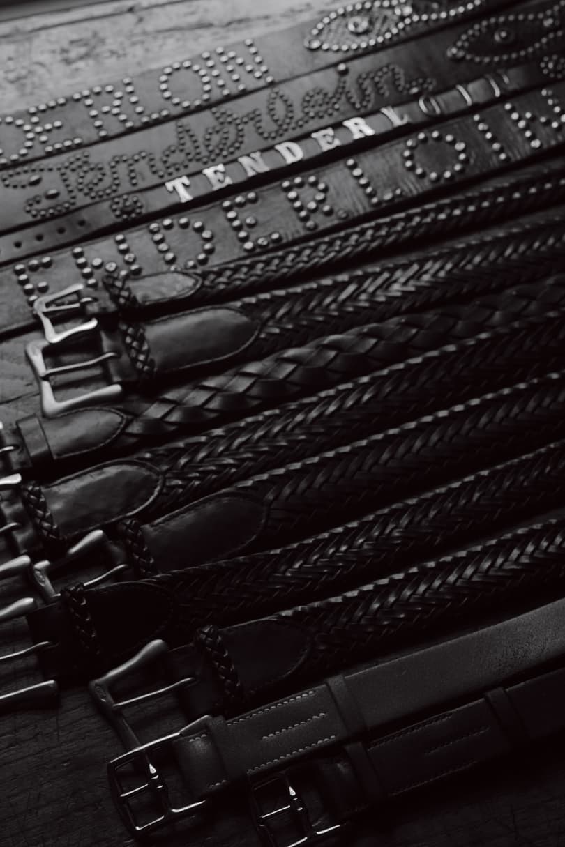 ベルトは装いの核となるメインディッシュだと語るのはスタイリストの渡邉康裕。200本以上集めてきたというレザーベルトのなかでも、選りすぐりのピースを覗かせてもらった。「ベルトというのは、自分のなかでは単にパンツを留めるものではありません。ベルトが決まらないとその日のスタイルが決まらない。アウターを選ぶのと違いはなく、漬物ではなくてメインディッシュと同等なんです。引いて見ると変わりませんが、身につけている自分にとっては、その日のチョイスひとつで全体のレベルが変わる。そのくらい面白いポジションなんです。例えばこのジェイエム・ダヴィッドソンのメッシュレザーベルト。僕はあえて一番長いものを買います。メッシュだと落ち感が出るのでベルトの先をしなやかに垂らせるんです。そしてこのテンダーロインのスタッズベルトですが、毎日のように履くデニムとの相性も良くて、最近また身につけるようになりましたね。手に入れたのは20年以上前ですが、ファッションには揺り戻しがあるので。エルメスのレザーベルトも、馬具に使っていた金具だったりと、革屋が作るベルトとしての背景がしっかりあります。デニムとの相性もすごくいい。オンスがしっかりあって、厚みもある。撮影の際に使用する時も、着用する人物に合わせ穴を開けることが多いのですが、傷がついても全く気にしませんし、逆に表情が増していいんです。自分自身のライフスタイルとして、実用的であることは絶対的に担保しないといけませんからね」。