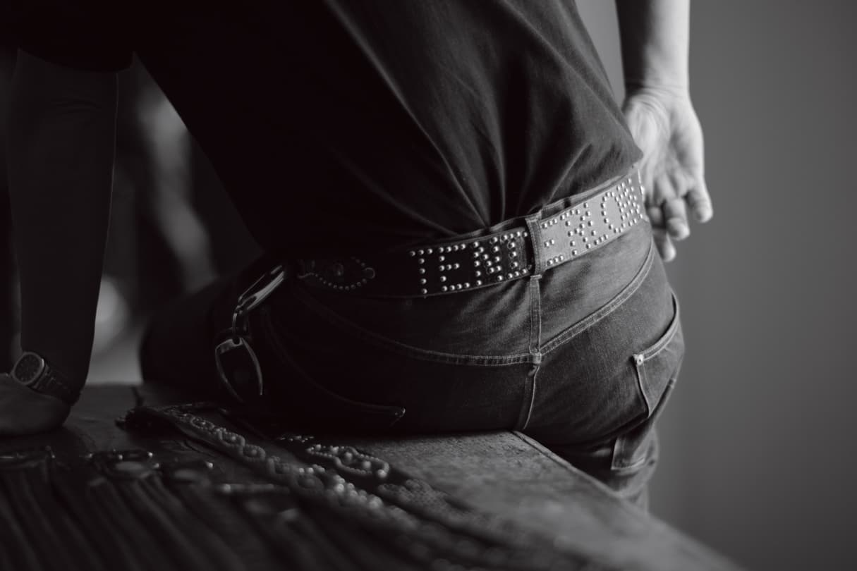 渡邉が選ぶレザーベルトには、時の試練に耐えうる道具としての強さが垣間見える。その腰元に巻かれた一本もまた、語らずとも彼の生き様を映し出しているかのようだ。