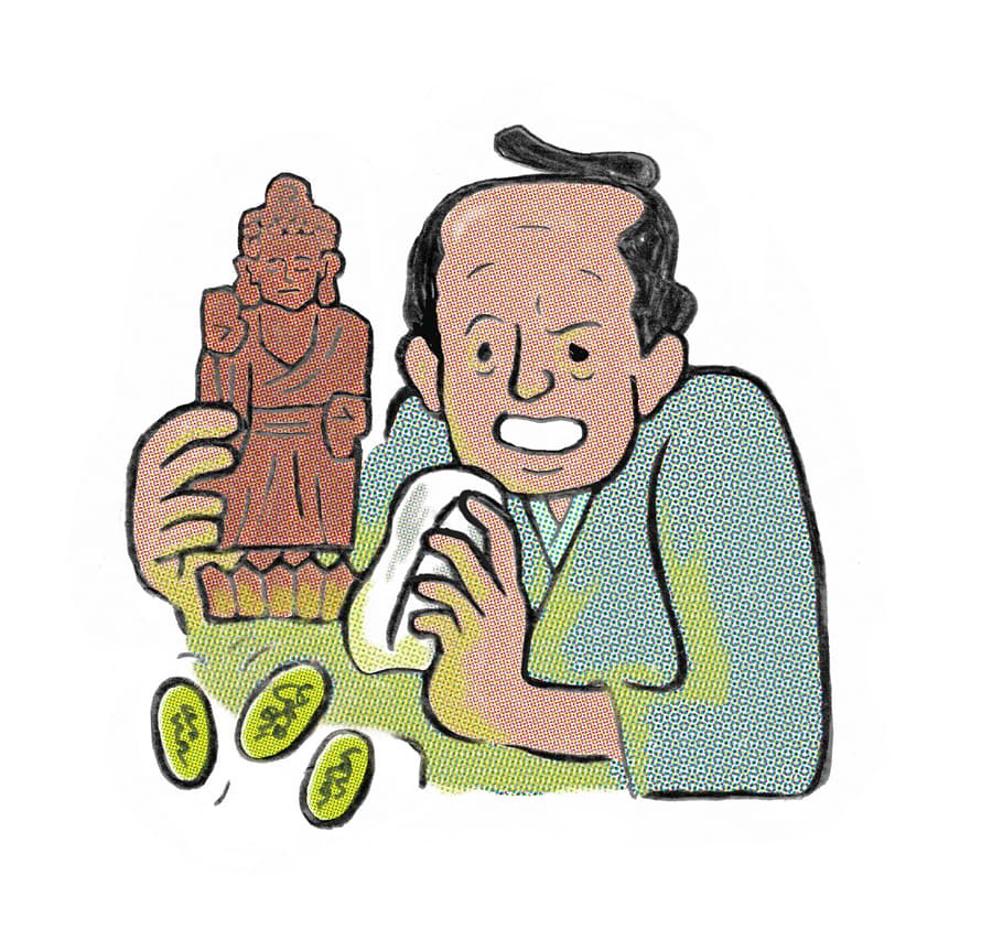 一方で、ゆずれない頑固さもまた落語の人物たちの魅力です。「井戸の茶碗」という噺は、貧乏長屋に暮らす武士からくず屋が買い取った仏像を別の武士が気に入って手に入れ、それを磨いたところ中から小判がでてくるというところからはじまる物語。貧乏長屋の武士は一度手放したものだからと主張し、もう一人の武士は仏像を買ったのであって小判を買ったわけではないと主張する。互いにゆずらない二人の間を右往左往するくず屋。この噺には、貧乏であれ、大金持ちであれ、一度言ったことは覆さないという強い意志と、お金への潔白さに心が洗われる気持ちになります。