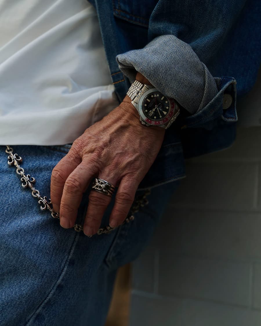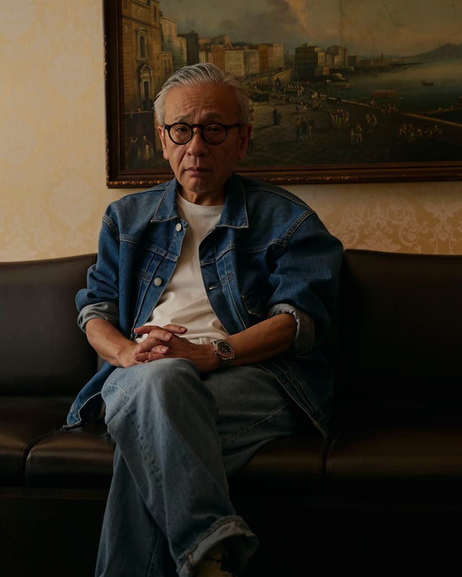 クールな男の条件として、『きっちりとした格好の時にリラックスして見えて、カジュアルな格好の時にだらしなく見えない』ということがあると思います。具体的にはタキシードとブルージーンズを例に挙げられます。タキシードの似合う人がブルージーンズも似合うとは限らないですが、ブルージーンズが似合う人は間違いなくタキシードも似合う。スーツを着ているとそれなりの人には見えますが、ブルージーンズは着ている人の人間性を透かして見せます。今日の取材にはどのような格好で来ようかと考え、あえてブルージーンズのセットアップと無地の白いTシャツにしました。世代を問わないタイムレスな格好ですが、着る人によって全然違う見え方になるからおもしろい。冬の場合は、迷ったら白黒のヘリンボーンのジャケットを羽織り、グレーフランネルのパンツを穿き、白いシャツを着てニットタイをすればいいのです。そういう余白や奥行きのある格好をする人が本当に洒落ていると思います」。