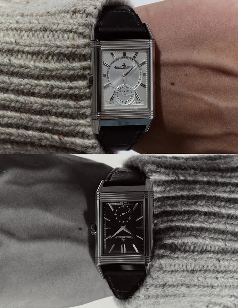ニットやスウェットといったカジュアルな装いに、スポーツウォッチではありきたりすぎる。粋な遊び心とシックさを併せ持つ現代のジェントルは、あえてクラシックウォッチを合わせたい。ジャガー・ルクルトの名作〈レベルソ〉から生まれた“レベルソ・トリビュート・デュオ・スモールセコンド”。2面ダイヤルによって、黒とシルバーをシーンに応じて切り替えられる仕様だ。仕事も遊びも、オンにもファッションにも。自在に寄り添うこの機能は、まさにニュージェントルにふさわしい。