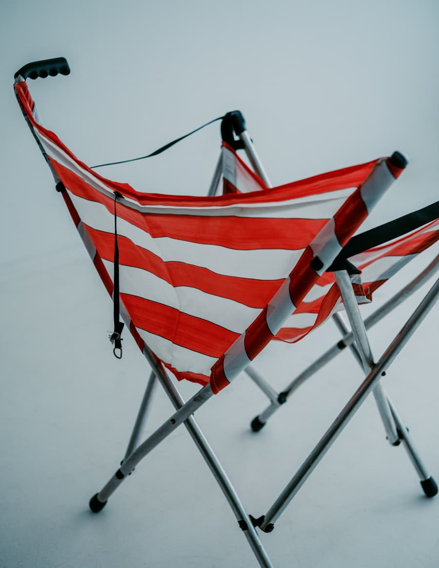 カラーは赤・青・緑の3色が存在するが、松浦がとくに気に入っているのは、赤と青のコンビだという。2脚を並べたときの色のバランス、キャンバス地のストライプ。どこか英国的な上品さと、70〜80年代のアウトドアギアらしい素朴さが同居している。