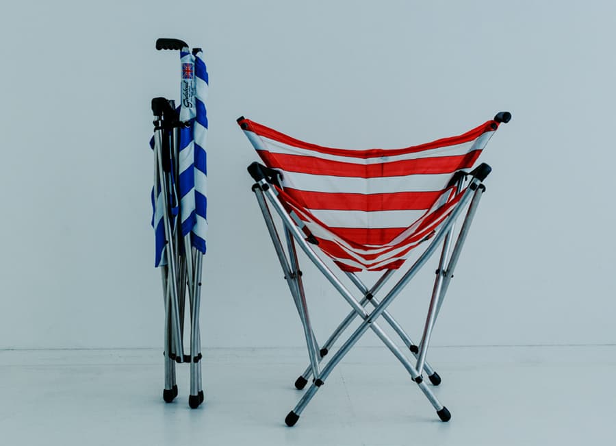 細いアルミフレームを畳んで、傘のようにくるりと巻いた生地を紐で止めると一本のステッキのようになる。イギリス生まれの折りたたみ椅子、ガダバウトチェアだ。「アウトドア好きの間ではちょっとした定番。アメリカ製のローンチェアはさらに有名ですが、ガダバウトチェアは意外と知られていないんですよね」と松浦は話す。少し前にキャンプブームがあったが、この椅子の名前を聞いたことのない人は多いのではないだろうか。だが、アウトドア好きの一部には長く愛されてきた“旅する椅子”である。