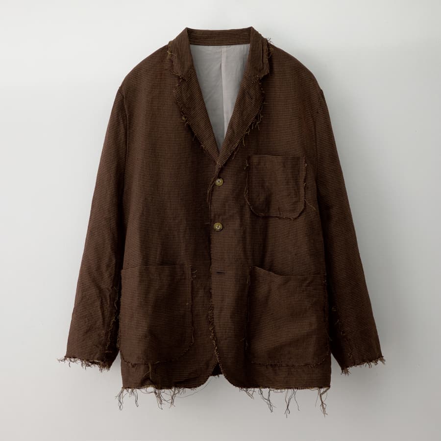 テーラードジャケットのシルエットは保ちつつ、生地のエッジ仕上げを施さず、あえての切りっぱなしが特徴。ウール素材で多く用いられるハウンドトゥース柄をあえてリネン素材で再現することで、ニードルズらしいクラシックな風合いとモダンな見た目が両立され、ラフでユニークな雰囲気を醸し出している。