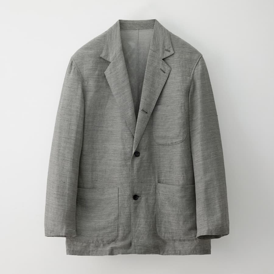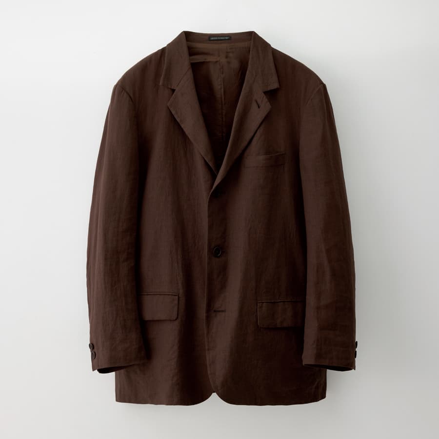 洗いをかけたリネンならではの自然なシワと奥行きが、深みのあるブラウンに豊かな表情を生む。3つボタンの端正な設計に、ふくらみのあるラペルがほどよい柔らかさを添え、落ち着いた品のある佇まいに。寒さがほどけ、日が伸びはじめた春の夕暮れ。そんな時間にさらりと羽織りたくなる1枚だ。