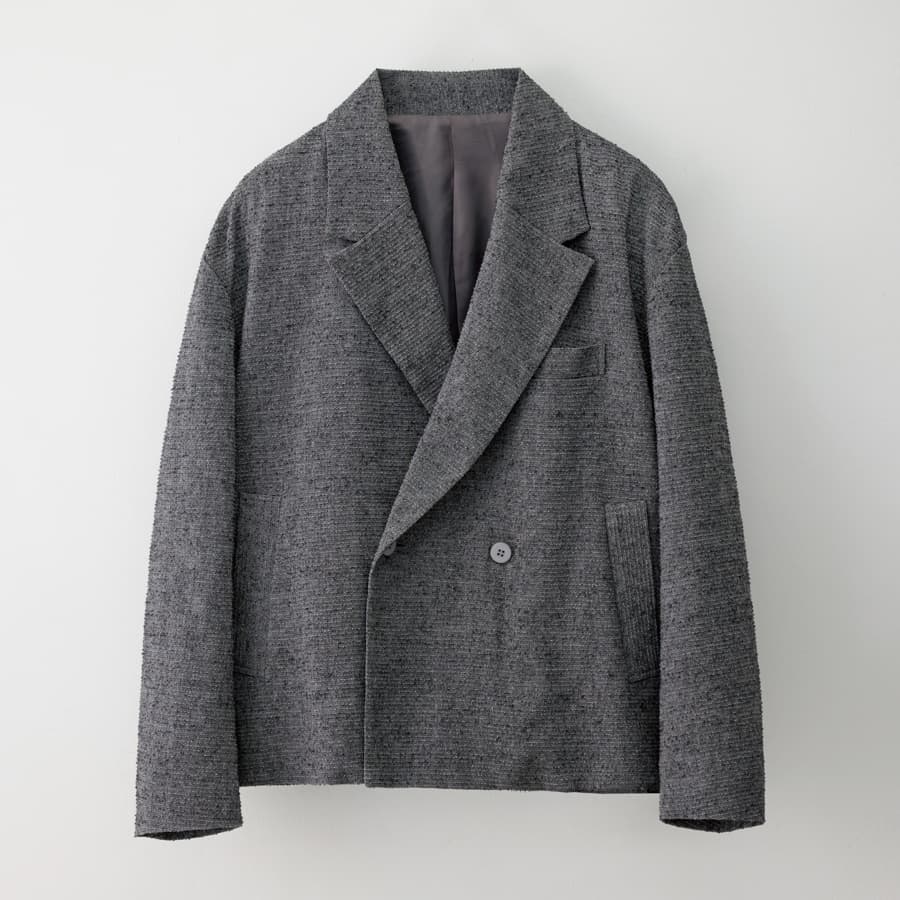 ビスコースとリネンを掛け合わせた先染めヘリンボーンが、素朴さとしなやかさを併せ持つ。身体の動きに沿って揺れるドレープが描く柔らかな曲線は、スタイリングに軽やかさを演出してくれる。装飾を削ぎ落としたダブルブレストのオーバーシルエットは構築的でありながら、さらりと羽織るだけで、肩の力が抜けたモダンな空気をまとう。