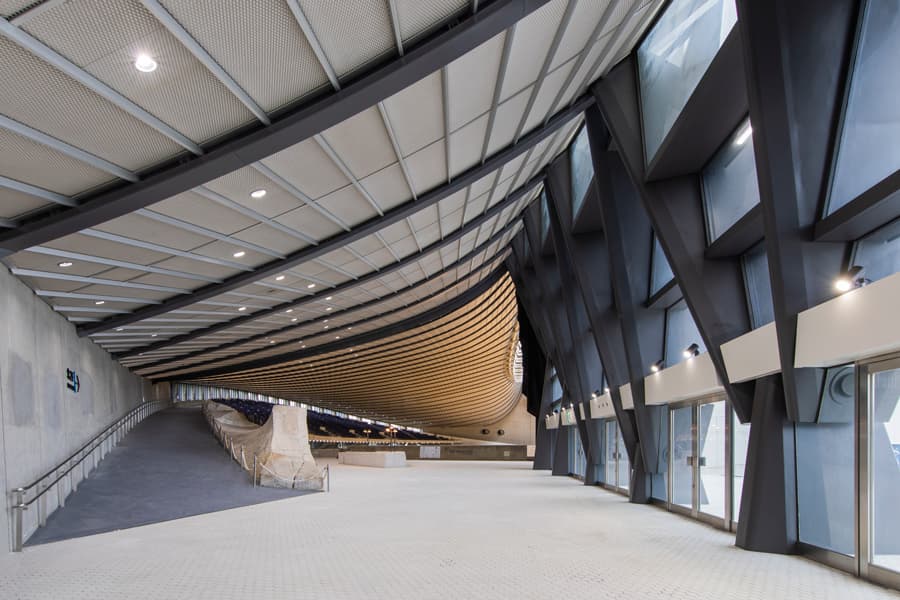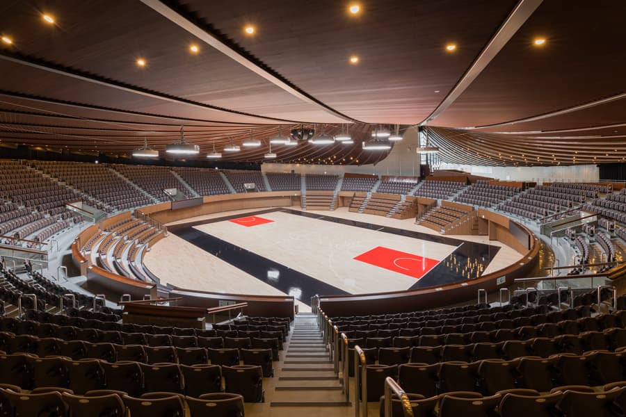 緩やかにそり返る屋根が一際優美だが、この形状は奈良時代の寺社建築の大伽藍の造形が取り入れられているという。かたや「渦巻き型」の独創的なフォルムを持つ第二体育館は、一本の主柱の頂上からのメインパイプがスカートのように広がり、内部空間は直径65mの円形プランとなっている。コートに向かってすり鉢状の観客席が急勾配に配置されていて、柱とパイプの隙間に設けられたトップライトから自然光が差し込む粋な工夫も施されている。