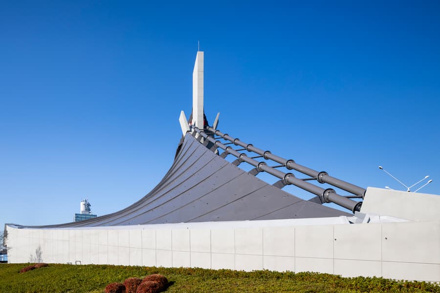 二つの建物がプロムナードでリズムよく結ばれ、芸術作品のような美しいフォルムを形作っている国立代々木競技場だが、しかしそのデザインには大きな懸念があった。それが屋根の強度と不安定さで、強風によって揺れたりたわんだりしてしまう危険性があったのだ。そこで、あらかじめ高強度のPC鋼材を用いて計画的にストレスを与えておく「プレストレス」という技術に加え、屋根の揺れを防ぐためにメインケーブルの端を約2,000トンものコンクリートや土砂のアンカーブロックに繋げ地中深くに埋めることでより頑丈な建物となった。